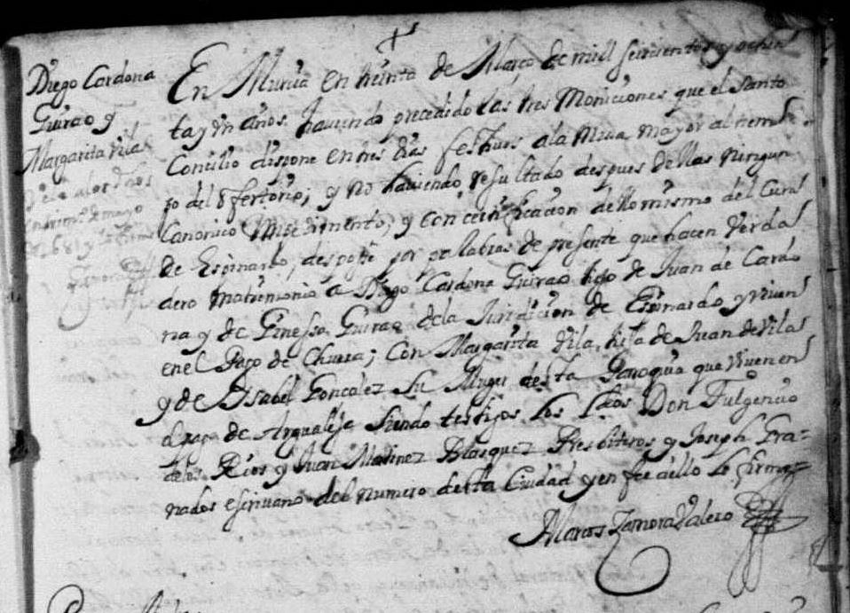 Por su parte, los padres de Juan, Diego Garcia Cardona y Margarita Vila (de los que sabemos por este testamento que eran naturales de Espinardo y Cocentaina, respectivamente) se casaron en Murcia, en la parroquia de San Antolín, el 30 de marzo de 1681. El registro confirma que Juan Cardona y Ginesa Guirao eran de la jurisdicción de Espinardo, además de informarnos de que vivían en el pago de Churra. Igualmente, nos indica que Juan de Vila e Isabel Gonzalez pertenecían a la parroquia de San Antolín de Murcia y que vivían en el pago de Argualeja.