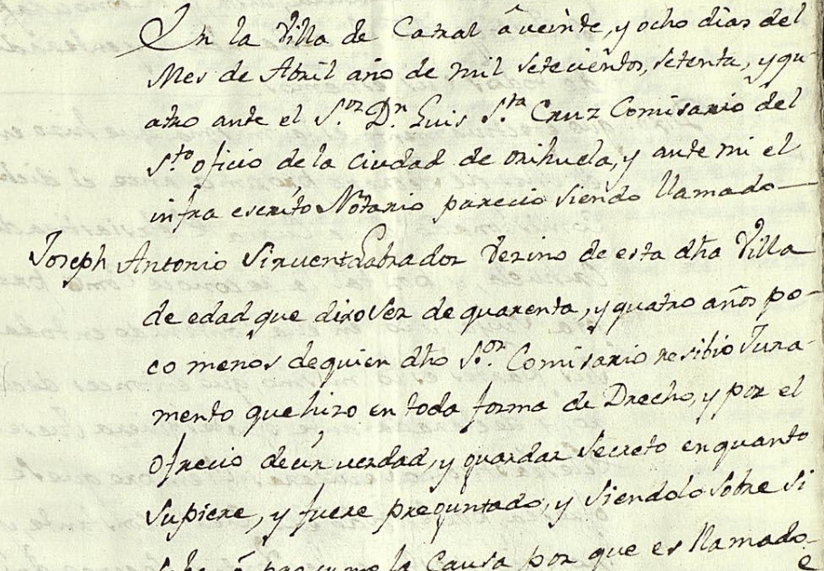 Por otra parte, contamos con información más personal al participar éste, cuando contaba con 44 años, como testigo en el proceso de fe de Miguel de Angulo, párroco de Catral. José Antonio compareció ante el notario Francisco Ballesta y el Comisario del Santo Oficio de la ciudad de Orihuela, D. Luis de Santa Cruz.
